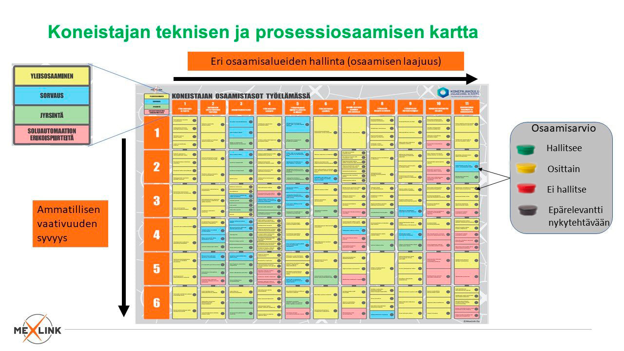 Kompetenz lässt sich durch verschiedenfarbige Markierungen visualisieren, die an jedem Kompetenzelement angebracht sind und deren Haltbarkeit und Haftfähigkeit mit einem Spülmaschinentest getestet wurden.